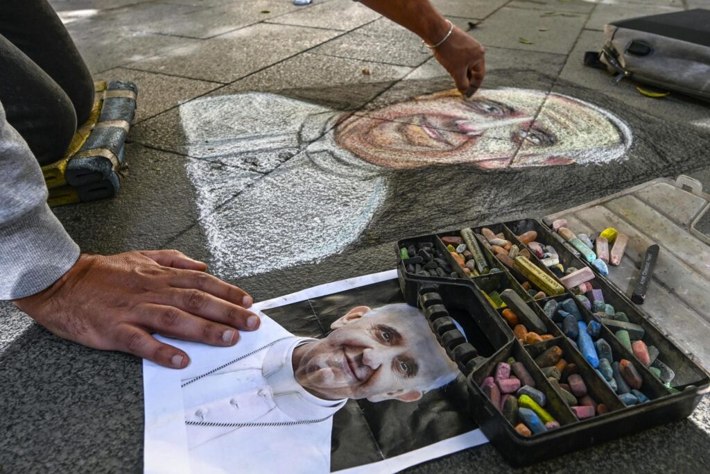 Artista de rua Stefano Buonante faz imagem do papa Francisco em Nápoles, Itália (Foto: EFE/EPA/CIRO FUSCO)