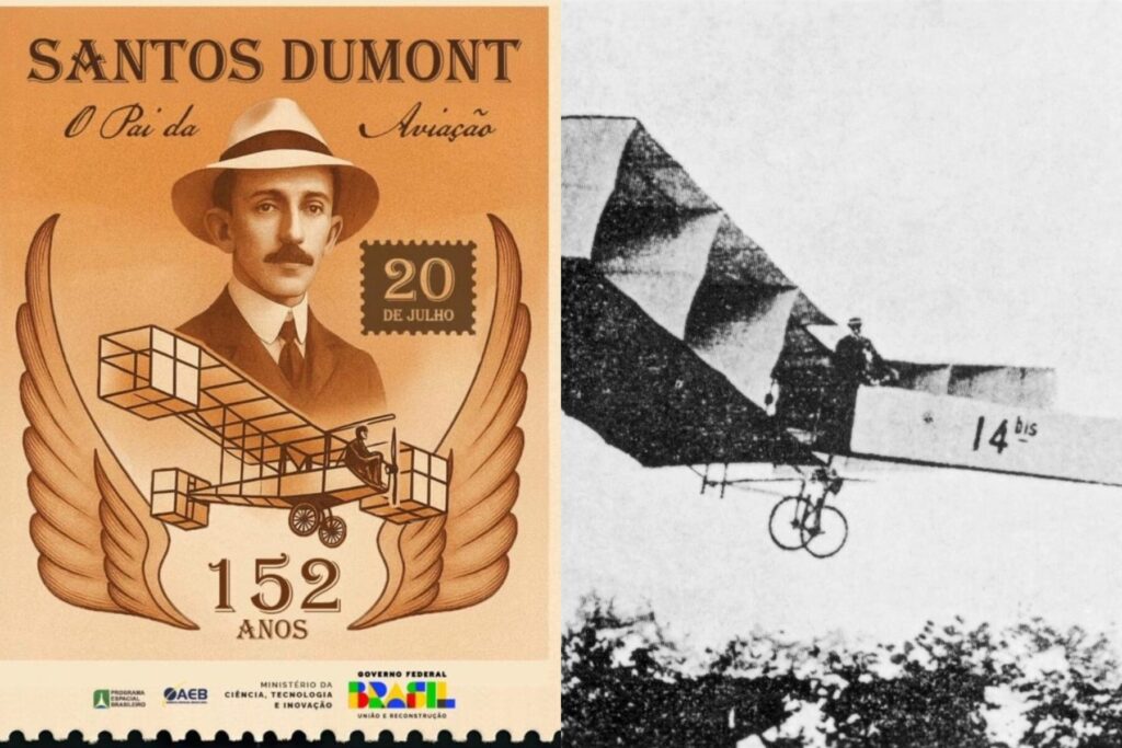A Agência Espacial Brasileira (AEB) divulgou uma ilustração, no último dia 20, em homenagem aos 152 anos do nascimento de Alberto Santos Dumont (1873-1932) com o aviador brasileiro pilotando sua famosa aeronave 14-Bis ao contrário. A arte foi criada por inteligência artificial e publicada nas redes sociais da agência.