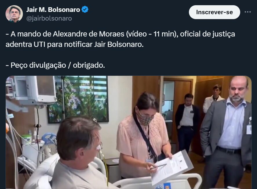 Bolsonaro divulgou nas redes sociais o vídeo do momento em que foi intimado no hospital. (Foto: Reprodução/X)