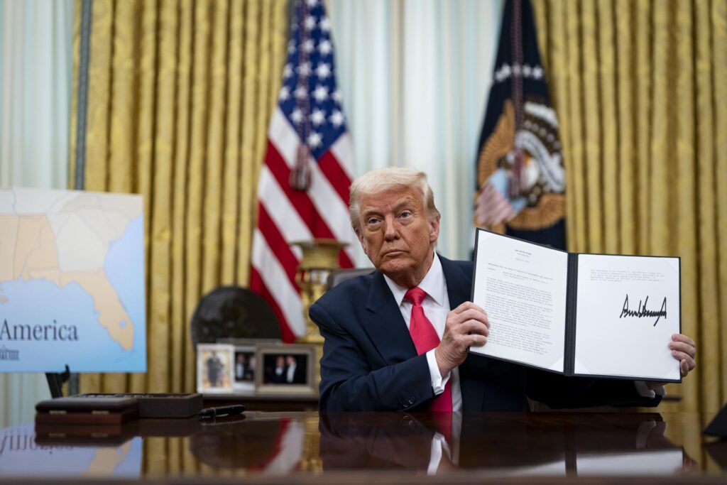 O presidente dos EUA, Donald Trump, exibindo ordem executiva no Salão Oval da Casa Branca em Washington, DC (Foto: EFE/EPA/AL DRAGO / POOL)