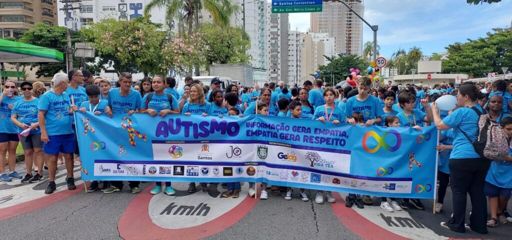 A orla da praia de Santos, entre o Canal 6 e a Fonte do Sapo, no bairro Aparecida, amanheceu tingida de azul na manhã do último domingo (6). Com o tema “Informação gera empatia, empatia gera respeito”, a tradicional Caminhada de Conscientização do Autismo, promovida pelo Grupo Inclusão para Todos com apoio da Prefeitura, integrou a programação do Abril Azul, mês dedicado à visibilidade e ao respeito às pessoas com Transtorno do Espectro Autista (TEA).