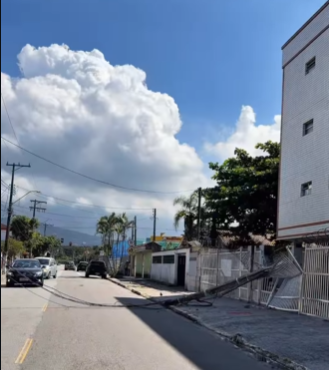 Um caminhão de carga provocou a queda de um poste sobre o portão de um edifício em Praia Grande, na manhã desta terça-feira (14). o incidente não deixou feridos.