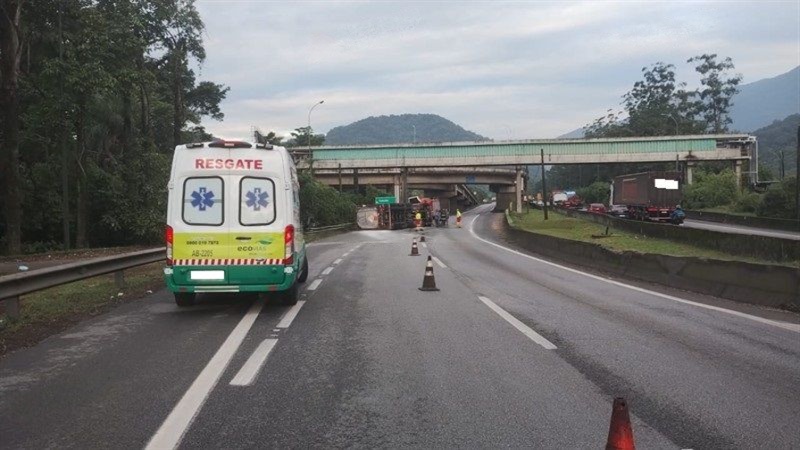 Um caminhão-tanque tombou na Rodovia Padre Manoel da Nóbrega, altura de Cubatão e derramou óleo na pista na manhã desta quinta-feira (2). Apesar da gravidade do acidente, ninguém se feriu.