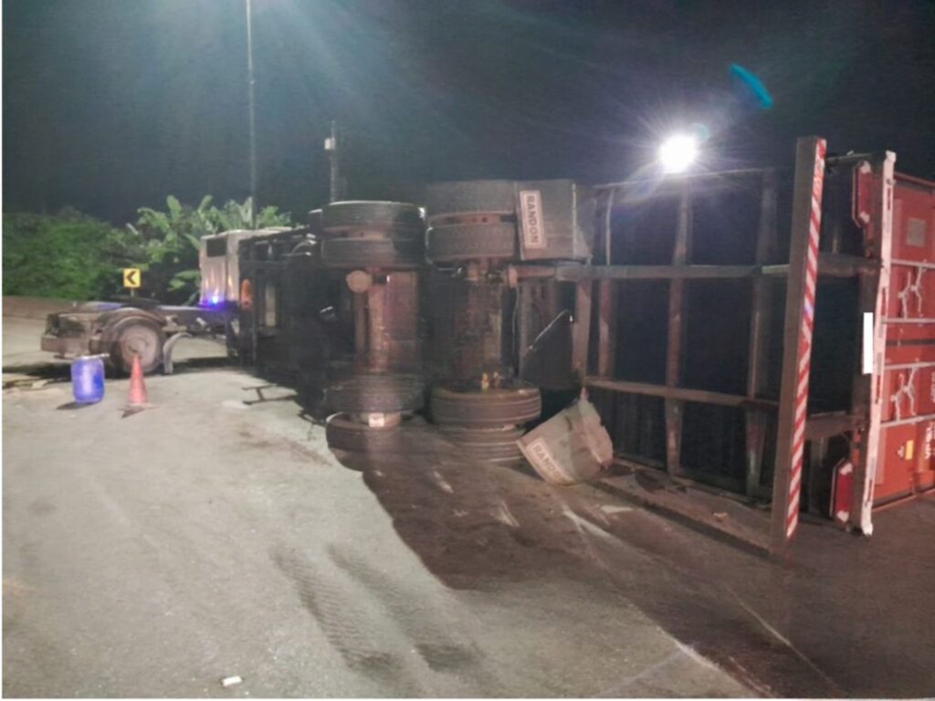 Um caminhão tombou na alça de acesso ao bairro Morrinhos, em Vicente de Carvalho, na madrugada deste sábado (11). Apesar do susto, não houve feridos.