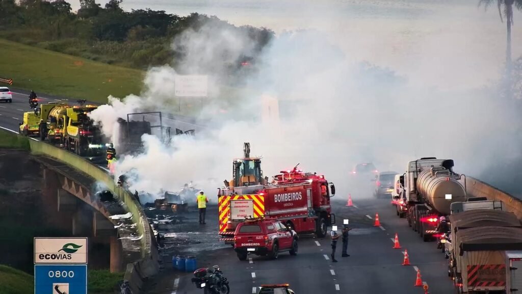 Uma carreta carregada com celulose tombou na Pista Sul da Rodovia dos Imigrantes, sentido Litoral, na madrugada desta quinta-feira (16). O acidente provocou um incêndio de grandes proporções no veículo e o consequente bloqueio total da via. Mesmo assim, não houve feridos.
