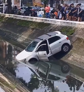 Um carro caiu dentro do Canal 3, no Gonzaga, em Santos, na tarde desta terça-feira (24). O acidente não deixou feridos, mas provocou um susto em quem passava pelo local.
