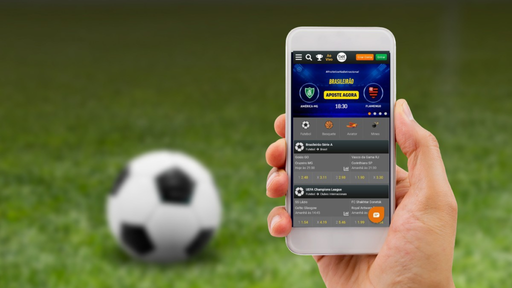Logo na tela inicial, há atalhos para campeonatos em destaque, eventos ao vivo e diferentes esportes, como futebol, tênis e basquete. O menu principal fica fixo na parte inferior, facilitando o acesso a categorias como esportes, apostas ao vivo, cassino e a caderneta. A área de perfil reúne funções de gerenciamento de conta, incluindo depósitos, saques, notificações, bônus e ferramentas de proteção.