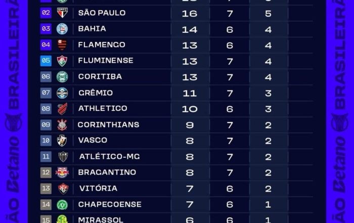 Classificação após a sétima rodada do Brasileirão 2026 (Crédito: @brasileirao)