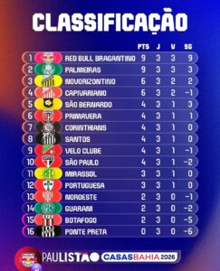 Confira a classificação após a terceira rodada do Paulistão 2026 (Crédito: @paulistão)