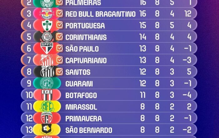 A primeira fase do Paulistão 2026 terminou neste domingo com a definição dos oitos classificados para as quartas de final e os dois times rebaixados para a Série A-2. Com a goleada por 6 a 0 sobre o Velo Clube, o Santos terminou na oitava colocação, com 12 pontos ganhos, conseguindo a última vaga nas quartas de final e agora vai enfrentar o Novorizontino.