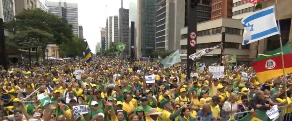 Chegada de Flávio Bolsonaro, Romeu Zema, Silas Malafaia e Nikolas Ferreira à Avenida Paulista. Foto: Reprodução/Live Gazeta do Povo (Foto: Foto: Reprodução/Live Gazeta do Povo)
