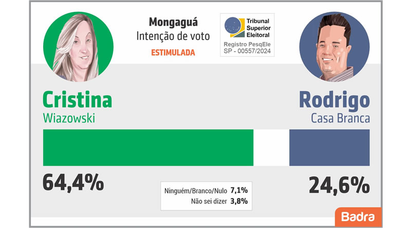 A pesquisa do Instituto Badra ouviu 1.060 eleitores, em diferentes pontos de fluxo de Mongaguá, nos dias 4 e 5 de junho. A margem de erro é de 3 pontos percentuais para mais ou para menos, com intervalo de confiança de 95%. Ela está registrada na Justiça Eleitoral, sistema PesqEle, sob o número 00557/2024.