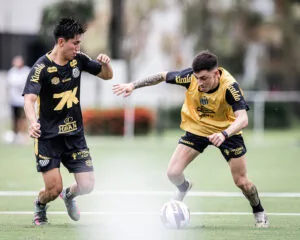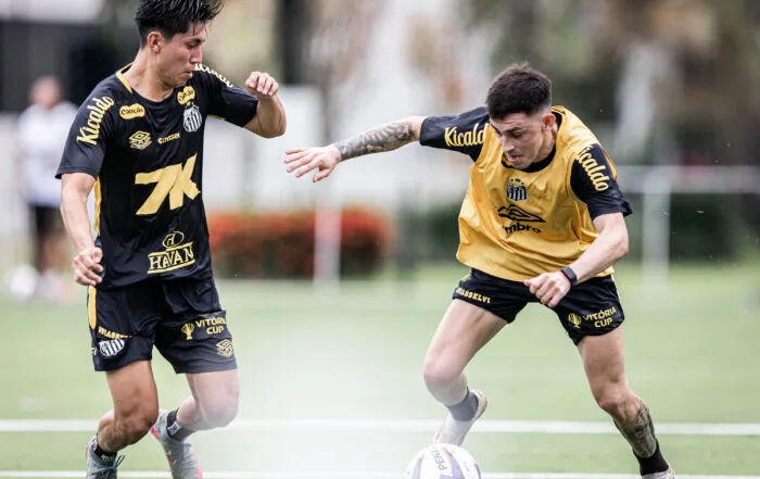 Miguelito e Escobar em ação no CT Rei Pelé (Crédito: Raul Baretta/Santos FC)