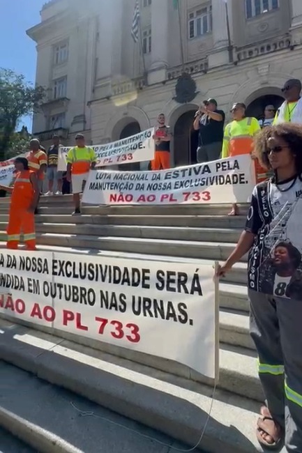 Os estivadores continuam o movimento contra o Projeto de Lei (PL) 733, que tramita na Câmara Federal, em Brasília (DF), e é visto como substituto da Lei dos Portos (2013), mas também uma brecha para a “quebra a exclusividades da categoria da estiva” nas atividades portuárias. Nesta quarta-feira (1), a categoria organizou mais um dia de greve, como tem ocorrido semanalmente, com manifestação em frente à sede da Autoridade Portuária de Santos (APS), caminhada até a Prefeitura de Santos, na Praça Mauá (Centro), onde lideranças se reuniram com o secretário municipal de Governo, Fábio Ferraz.
