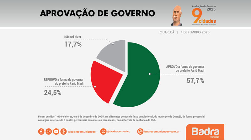 Os dados são do Instituto Badra, especializado em pesquisas de opinião e avaliação de gestões municipais, que ouviu 1.060 eleitores presencialmente em 4 de dezembro, em um levantamento com 95% de confiança e margem de erro de 3 pontos percentuais.