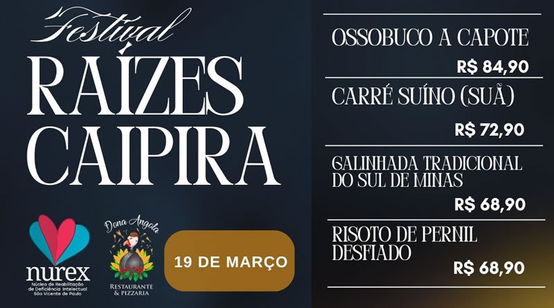 A tradição da culinária caipira ganha um toque especial de solidariedade no dia 19 de março, com a realização do Festival Raízes Caipira, promovido pelo Restaurante Dona Angola em parceria com o Núcleo de Reabilitação de Deficiência Intelectual São Vicente de Paulo (NUREX), em Santos.