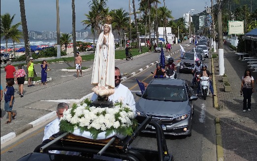 A imagem peregrina de Nossa Senhora de Fátima, vinda diretamente de Fátima, Portugal, chegou a Guarujá no último sábado (3). A santa é uma das padroeiras da Cidade, ao lado de Santo Amaro, e a visita especial marca as comemorações de 90 anos da Paróquia Nossa Senhora de Fátima e Santo Amaro e 50 anos da Irmandade de Nossa Senhora de Fátima. A imagem ficará no Município até o final do mês. O evento tem o apoio da Prefeitura de Guarujá, através da Secretaria Municipal de Direitos Humanos e Cidadania (Sedhuci).