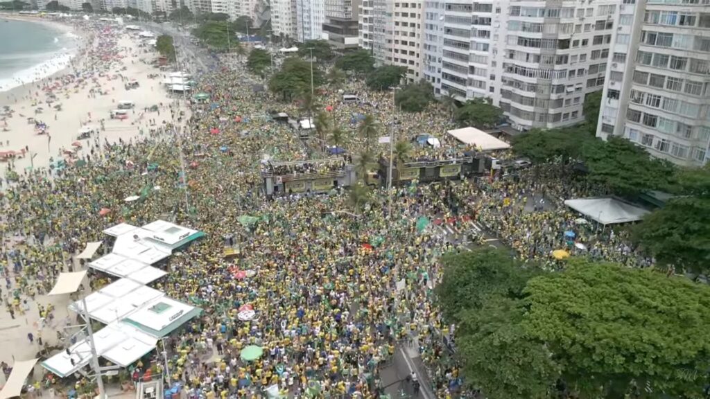 Milhares de pessoas se reuniram em Copacabana na manhã do domingo (16), em ato pela anistia aos presos do 8/1. (Foto: Reprodução/Youtube/ Pastor Silas Malafaia)