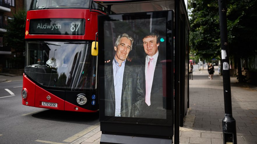 Enquanto Trump se vê no centro de uma polêmica sobre a divulgação de documentos confidenciais e inéditos do caso, fotos do republicano ao lado de Epstein foram instaladas em um ponto de ônibus próximo à embaixada americana em Londres.