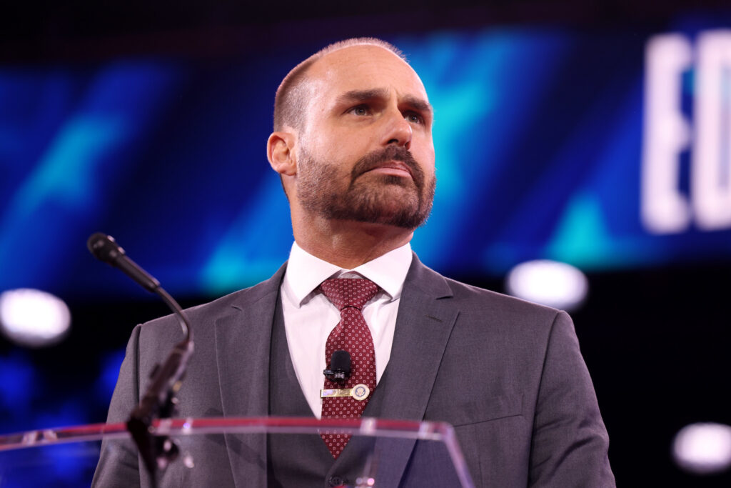 O filho do ex-presidente Jair Bolsonaro (PL) é acusado de buscar, em articulações com as autoridades americanas, sanções contra o ministro Alexandre de Moraes e contra o procurador-geral da República, Paulo Gonet. As articulações teriam como objetivo obter decisões favoráveis a ele e a seu pai.