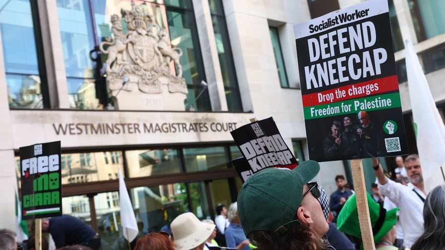 O rapper Mo Chara, do trio irlandês Kneecap, compareceu nesta quarta (18) ao Tribunal de Magistrados de Westminster, em Londres, para responder a uma acusação de terrorismo, e foi recebido por uma multidão de fãs, ativistas pró-Palestina e apoiadores do grupo. Do lado de fora, cartazes com mensagens como “Free Palestine” e “Defendam o Kneecap” tomaram as ruas, com direito a discursos, bandeiras palestinas e até a presença do lendário músico Paul Weller.