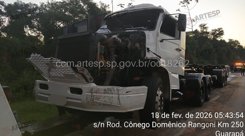 De acordo com o Centro de Controle Operacional, o motorista de uma carreta Volvo trafegava pela faixa 2 quando foi fechado por outro veículo pesado não identificado. Ao tentar evitar a colisão, ele desviou para o acostamento, atingiu a defensa metálica e o veículo acabou tombando em um barranco.