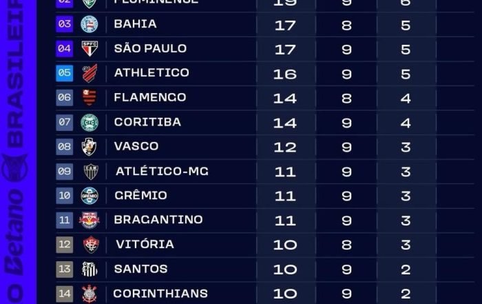 Classificação após a nona rodada do Brasileirão 2026 (Crédito: @brasileirao)