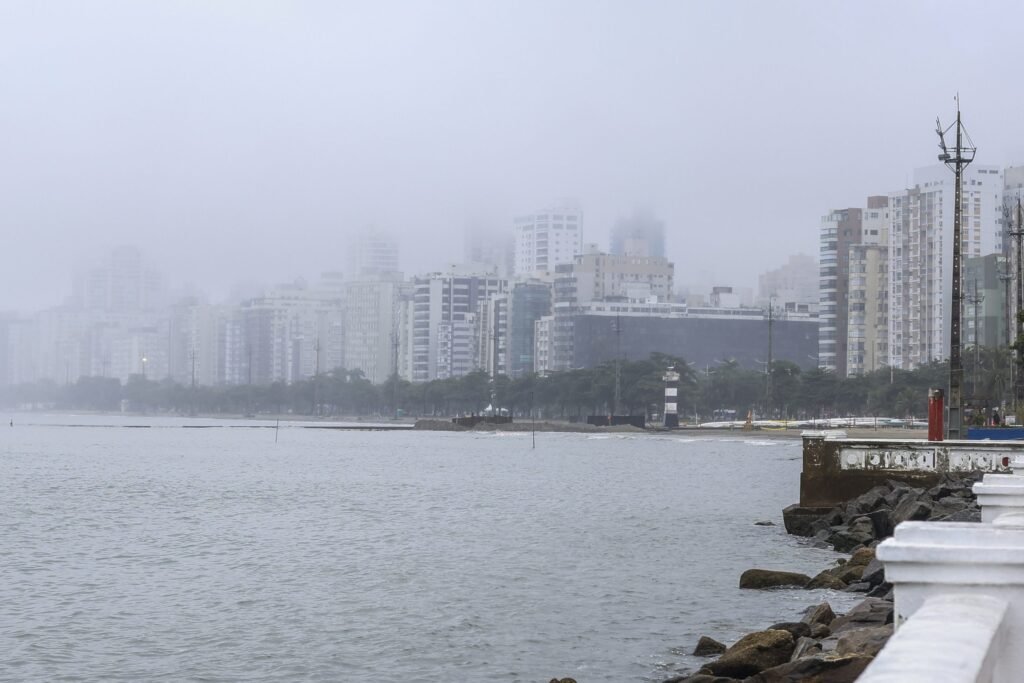 Baixada Santista terá tempo úmido e nublado nos próximos dias, com chuva fraca no fim de semana e chegada de frente fria na segunda-feira com ventos de até 80 km/h.