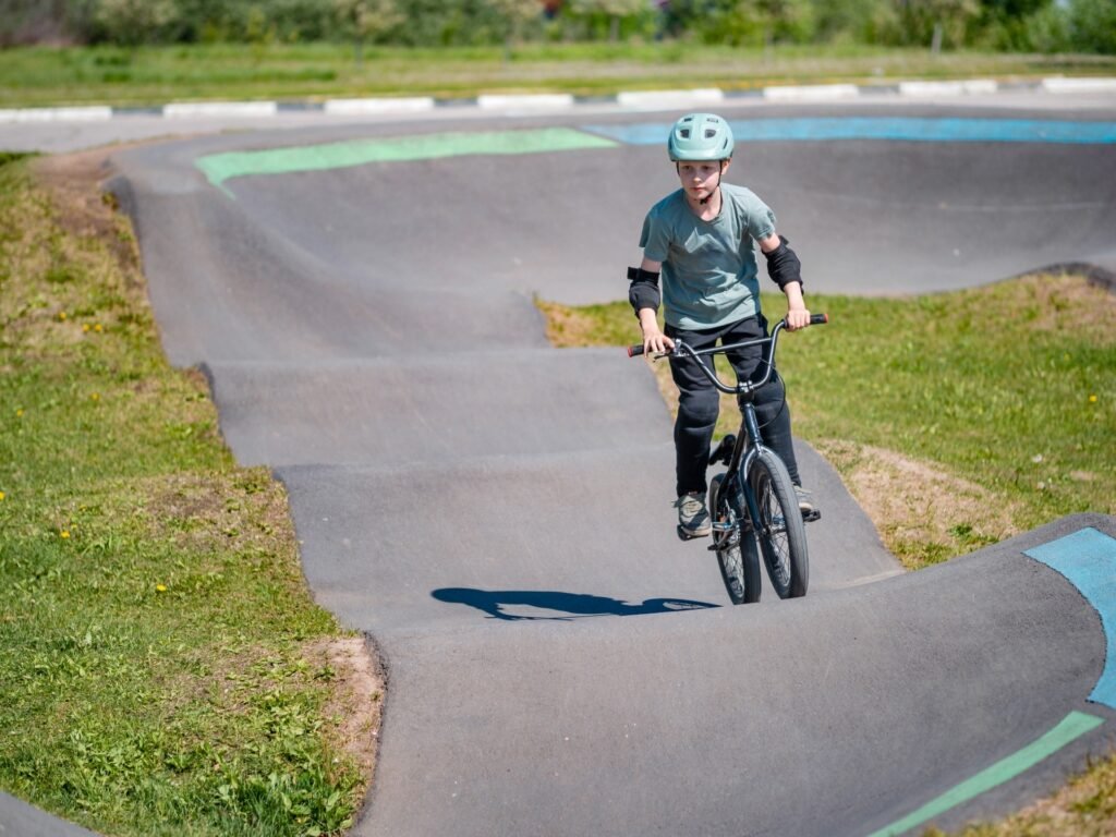 O pump track é um circuito contínuo, com ondulações e curvas, que permite aos praticantes ganharem velocidade por meio do movimento do corpo, além da realização de manobras.