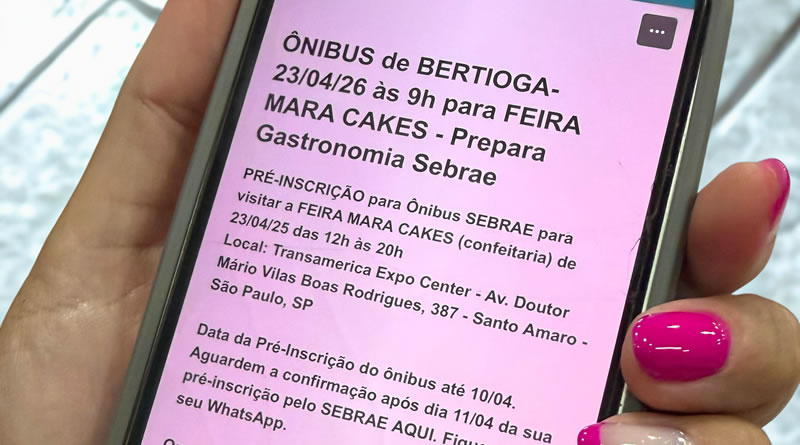 A visita à feira está programada para 23 de abril, no Transamerica Expo Center, localizado em São Paulo. O transporte será realizado em ônibus disponibilizado pelo Sebrae, com saída às 9h, do posto Sebrae Aqui Bertioga, no Poupatempo (Av. 19 de Maio, 694, Jardim Albatroz), e retorno previsto para 20h.