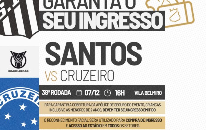 O Santos abriu a venda de ingressos para o jogo contra o Cruzeiro, na Vila Belmiro. A partida, válida pelo Campeonato Brasileiro, será realizada no domingo, dia 7 de dezembro, às 16h. A Lei Estadual nº 18.159/2025, de São Paulo, garante gratuidade em eventos esportivos para crianças de até 2 anos incompletos, que devem permanecer no colo do responsável. Não há gratuidade para idosos ou pessoas com deficiência.