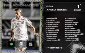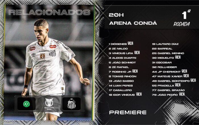 O Santos divulgou os relacionados para o duelo contra a Chapecoense nesta quarta-feira (28), às 20 horas, na Arena Condá, pela primeira rodada do Brasileirão. São 24 jogadores na lista, sendo três goleiros, quatro zagueiros, quatro laterais, sete meio-campistas e seis atacantes. Como só pode 23 atletas por jogo, algum deverá ser cortado.
