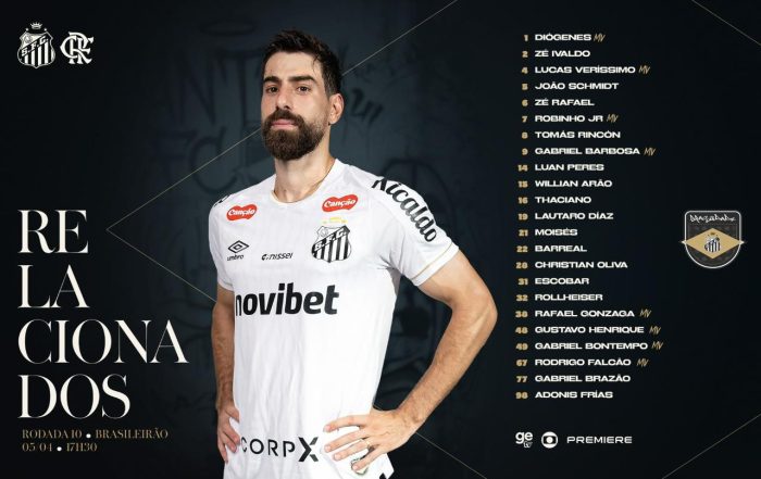 O Santos divulgou os relacionados para o jogo contra o Flamengo neste domingo (05), às 17h30min, no Maracanã, pela décima rodada do Brasileirão. Na lista, são 3 goleiros, 4 zagueiros, 2 laterais, 8 meio-campistas e 6 atacantes.