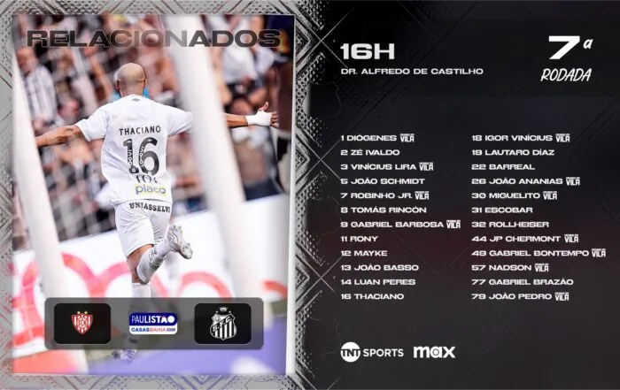 O Santos divulgou na manhã deste domingo os jogadores relacionados para a partida contra o Noroeste, às 16 horas, no Estádio Alfredo de Castilho, em Bauru, em partida válida pela sétima rodada do Paulistão 2026.