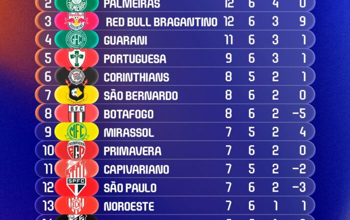 Classificação do Paulistão após os jogos deste domingo (Crédito: @paulistao)
