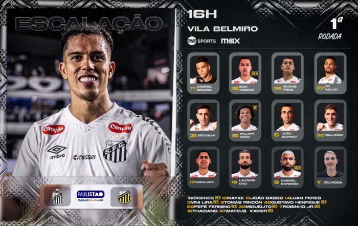 O Santos está escalado para sua primeira partida de 2026 e vai a campo com a base do time que encerrou a última temporada, mas com mudanças causadas por desfalques e pela entrada de um reforço no setor ofensivo.