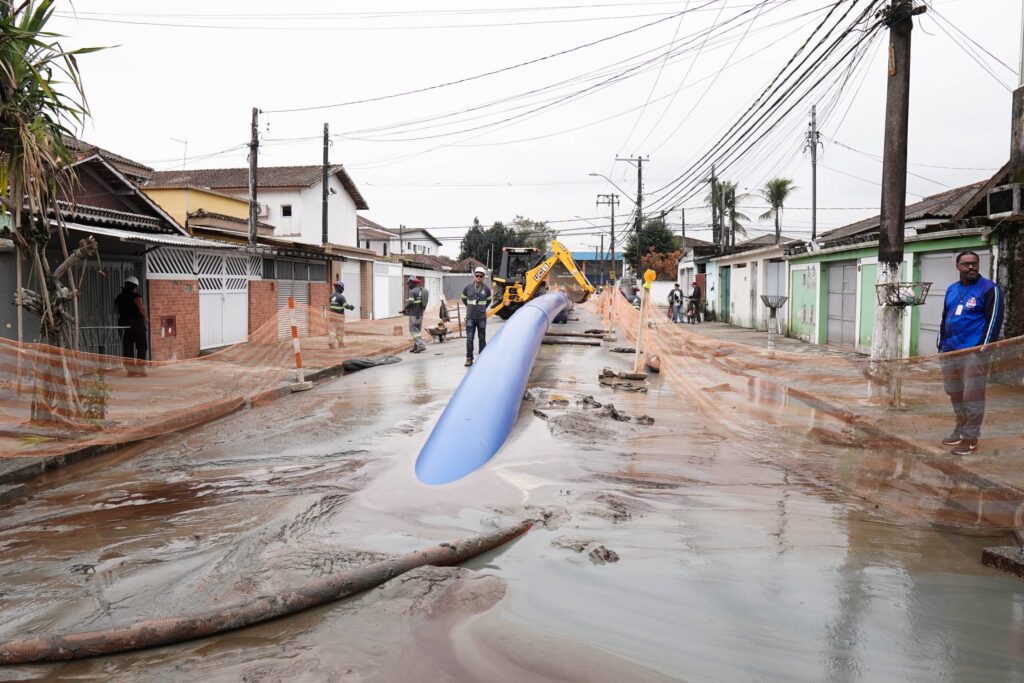As obras, com conclusão prevista para julho de 2026, envolvem a instalação de 5,56 km de tubos, sendo cerca de 1,5 km em travessia subaquática, ampliando a capacidade de transporte de água sem prejuízo ao abastecimento de Santos e Cubatão.
