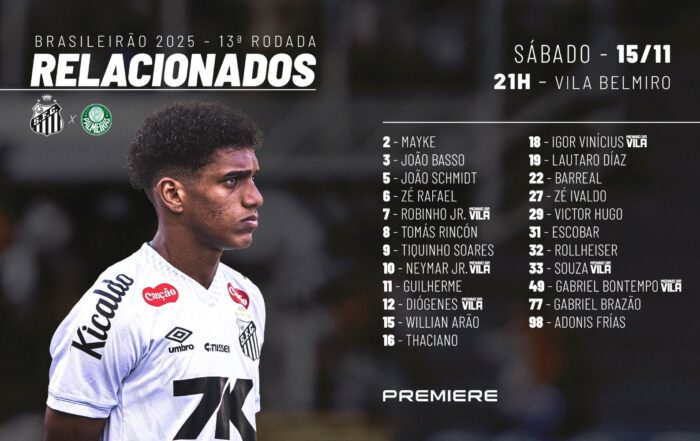 Confira os jogadores relacionados pelo Santos para o duelo contra o Palmeiras (Crédito: Divulgação)