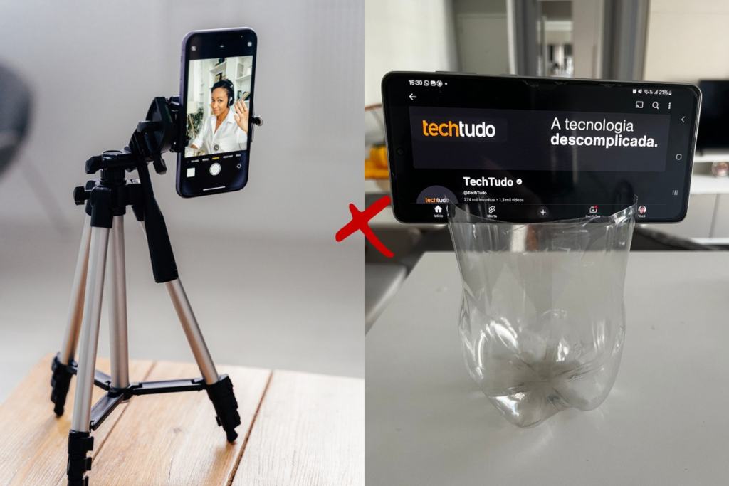 Passo 6. Tripé pronto para uso. Com a abertura feita, o tripé está pronto. No nosso teste, como estávamos em ambiente interno e sem vento, não foi necessário adicionar peso na base. No entanto, o ideal é colocar areia, terra ou pedras dentro da garrafa para dar mais estabilidade. O suporte funciona bem para assistir vídeos na cozinha, por exemplo. Dá até para lavar louça enquanto acompanha um conteúdo no celular com conforto.