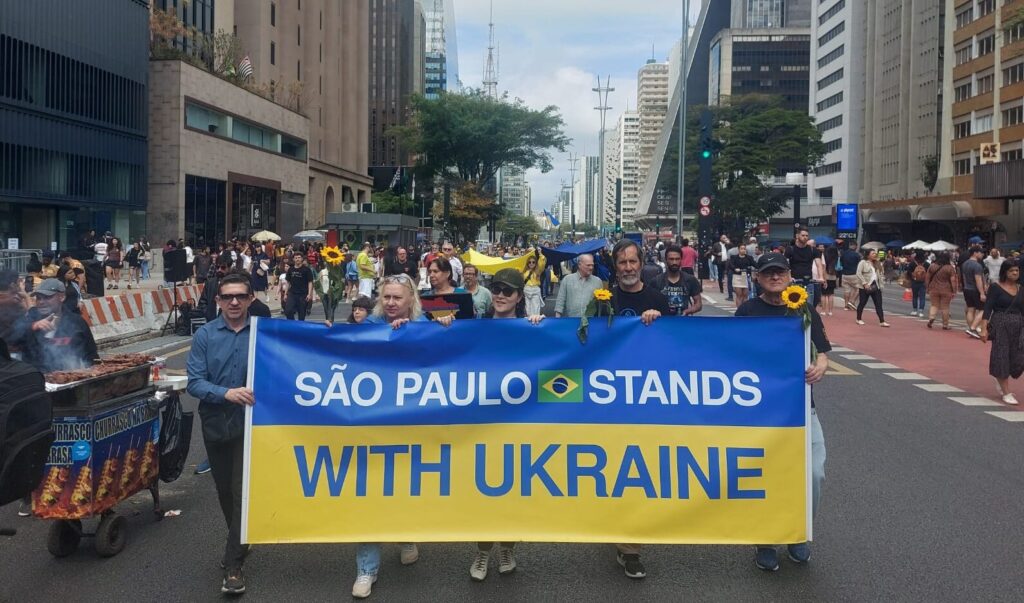 Membros da embaixada ucraniana e do consulado local fizeram discursos agradecendo o apoio e pedindo paz. O cônsul honorário de São Paulo, Jorge Rybka, fez críticas a empresas privadas brasileiras que estão comprando óleo diesel e outros produtos da Rússia sem se importar que o dinheiro está ajudando a financiar mais mortes na Ucrânia.