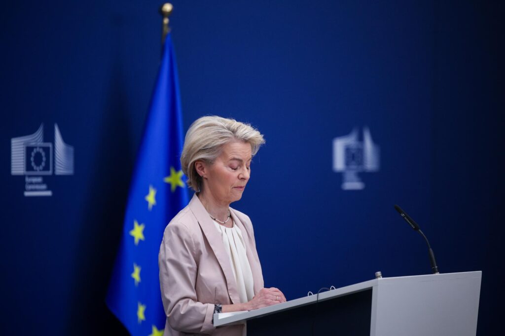 A presidente da Comissão Europeia, Ursula von der Leyen: UE dá sinal verde para contramedidas ao tarifaço de Trump (Foto: EFE/EPA/OLIVIER MATTHYS)