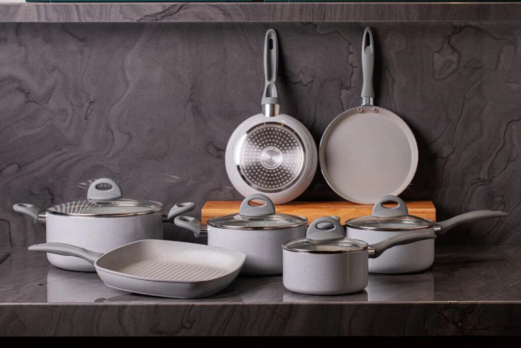 Voltado para quem busca um kit completo e visual moderno, o jogo de panelas Pratic Cook Fundo Triplo da Mimo Style tem estrutura de alumínio, revestimento cerâmico e inox. São duas caçarolas (3,5 L e 2,5 L), duas panelas (1,85 L e 1,34 L), duas frigideiras (1,2 L e 900 ml) e uma leiteira de 1,5 L. O conjunto inclui escumadeira, concha e espátula de silicone, além de tampas de vidro temperado com saída de vapor e cabos de baquelite.