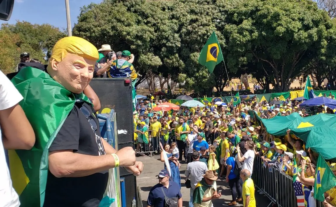 Homem com máscara do presidente dos EUA Donald Trump durante mobilização em Brasília. (Foto: Aline Rechmann/Gazeta do Povo)